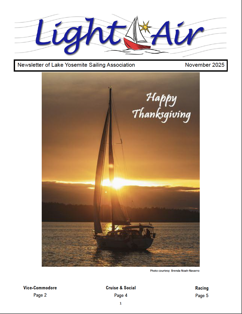 Light Air is the monthly Lake Yosemite Sailing Association newsletter emailed to members and others interested in LYSA activities. Click the image below for the latest issue or browse the newsletter archives for past issues.